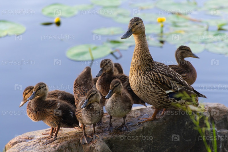 Утка с утятами стоит на камне и настороженно смотрит в камеру