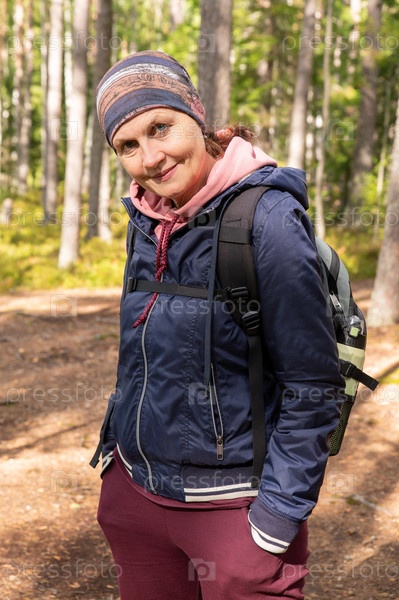 Взрослая привлекательная женщина в спортивном костюме и куртке с небольшим рюкзаком за плечами