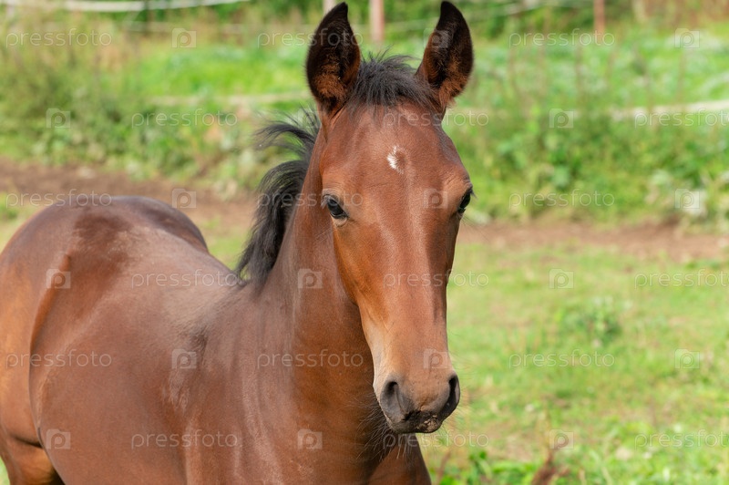 Коричневый жеребенок с белым пятном на лбу пасется на зеленом лугу