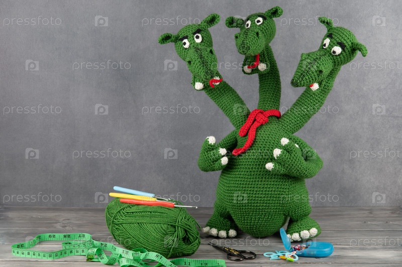 Зеленый дракон с тремя головами, связанный из толстой пряжи. Рядом моток пряжи, крючки и ножницы