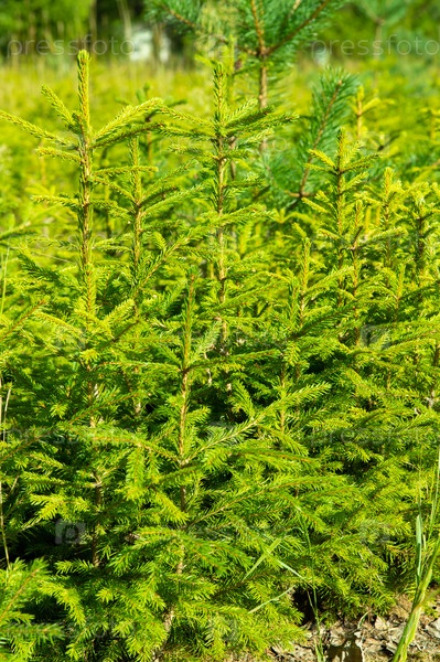 Заросли молодых елей, освещенные ярким осенним солнцем