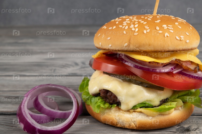 Гамбургер в поджаренной булочке с кунжутом, солеными огурцами и спелыми помидорами