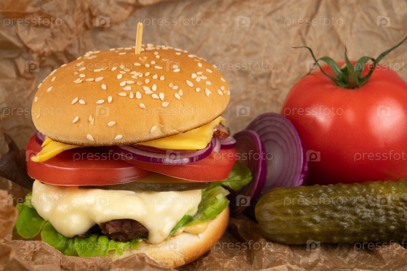 Гамбургер в поджаренной булочке с кунжутом, солеными огурцами и спелыми помидорами