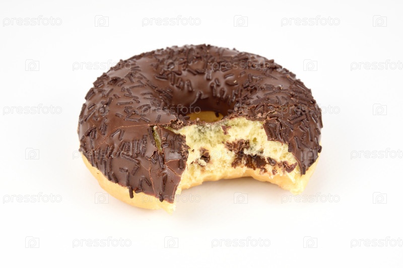 Пончик, покрытый шоколадной глазурью, от которого откушен кусочек
