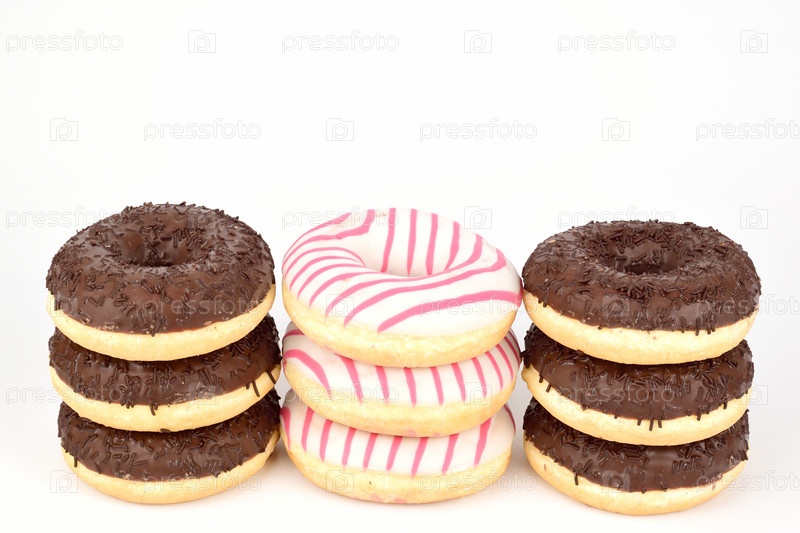 Три стопки пончиков в шоколадной и белой глазури. По три пончика в каждой башне