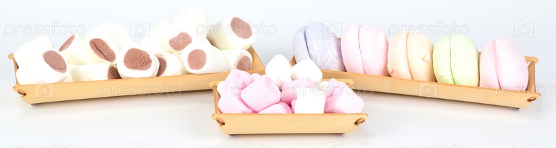 Разнообразные зефирки, выложенные на деревянных подносах