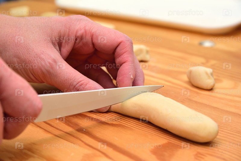 Женские руки режут колбасу из теста на маленькие кусочки