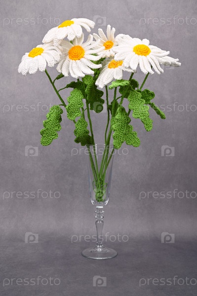 Букет ромашек связан из мягкой пряжи. Букет находится в стеклянном фужере