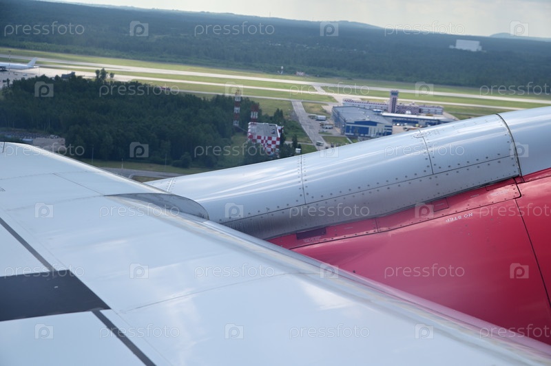Крыло и турбина взлетающего самолета