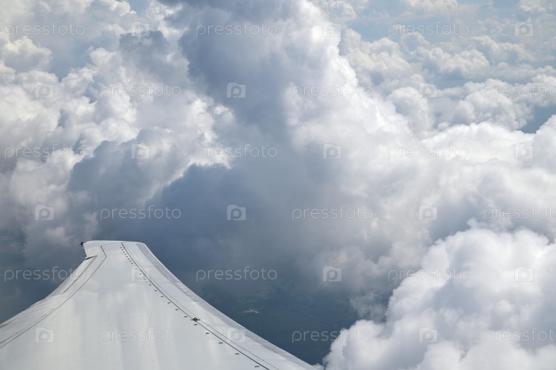 Вид из иллюминатора на крыло летящего самолета на фоне кучевых облаков