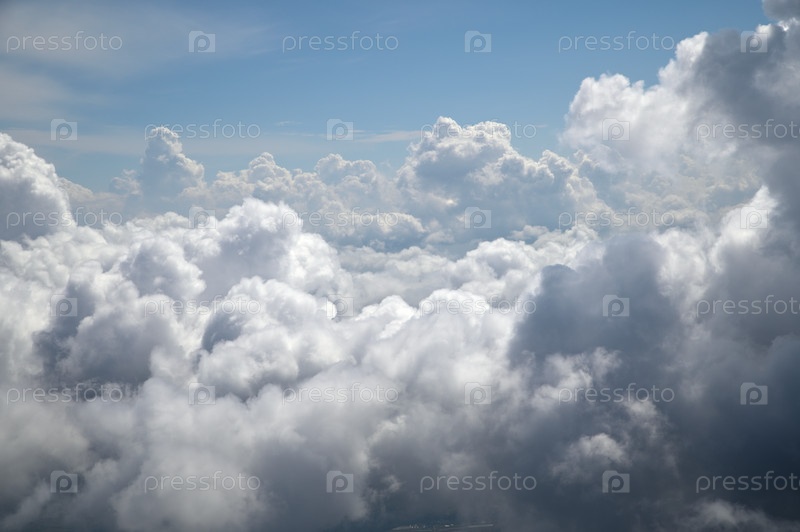 Пышные кучевые облака, видимые из самолета через иллюминатор