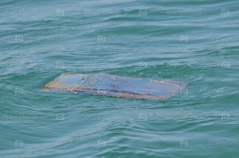 Лист крашеной фанеры плавает в зеленой морской воде