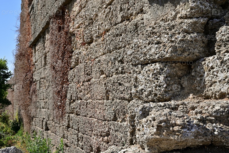 Детальный вид фрагмента древней крепостной стены, разрушенной и заросшей виноградной лозой