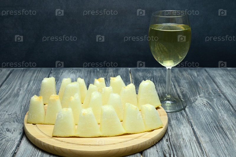 Несколько ломтиков спелой дыни, нарезанных на мелкие кусочки, лежат на разделочной доске. Рядом стоит бокал белого вина. Деревянный стол служит подвалом