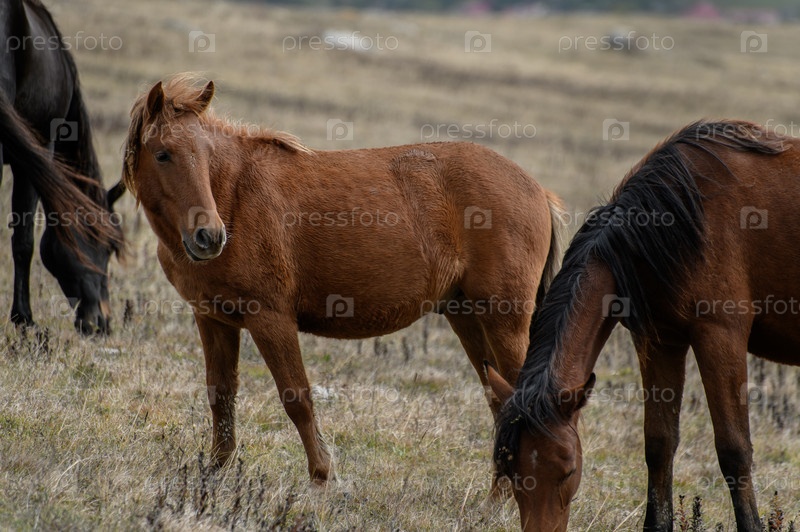 Коричневый конь пасется на осеннем лугу