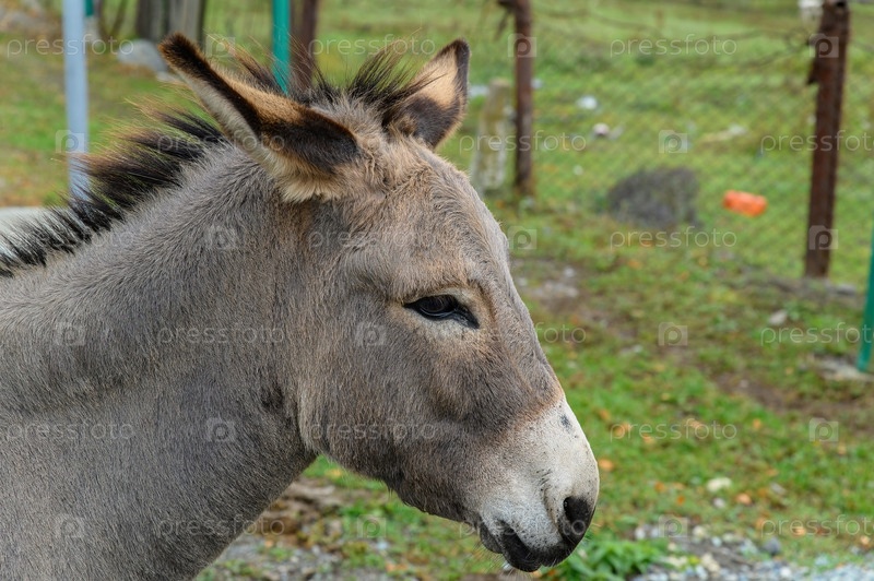 Голова серого осла с торчащими ушами и короткой черной гривой