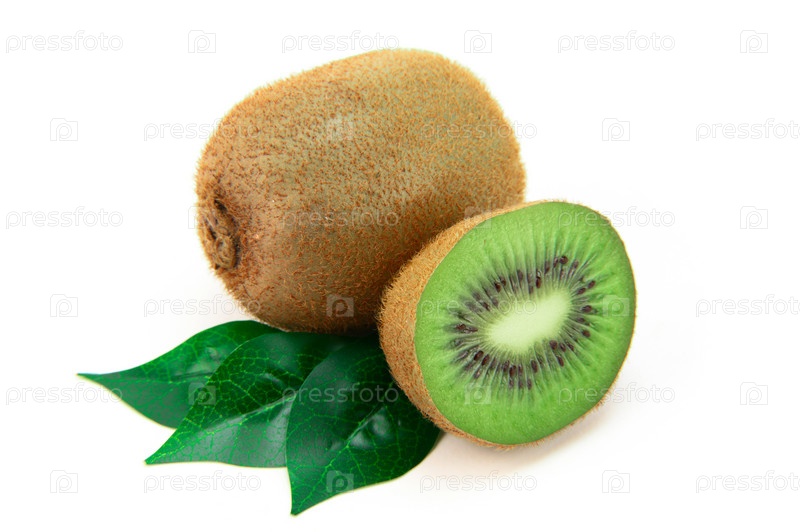 Половина киви рядом с целым неочищенным фруктом с зелеными листьями