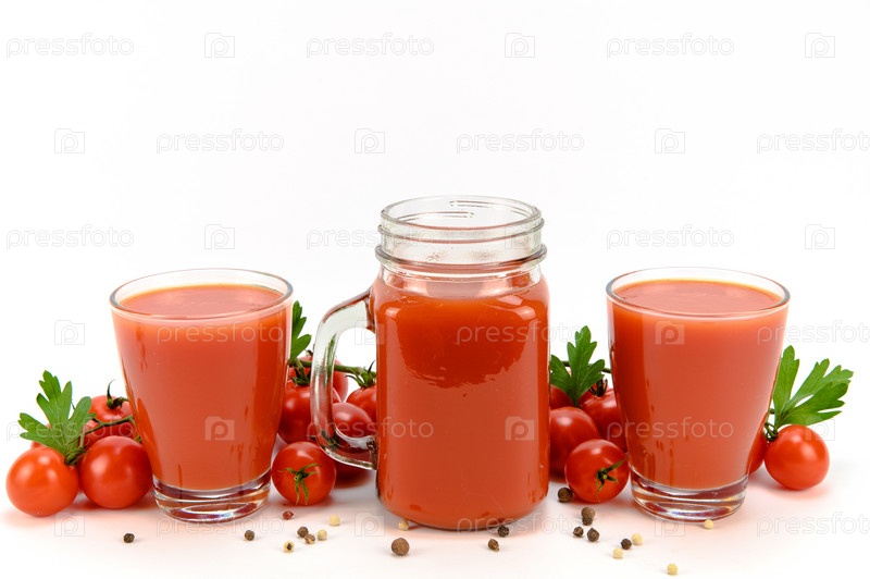 Банка и два стакана, наполненные томатным соком. Помидоры, петрушка и душистый перец горошком лежат вокруг