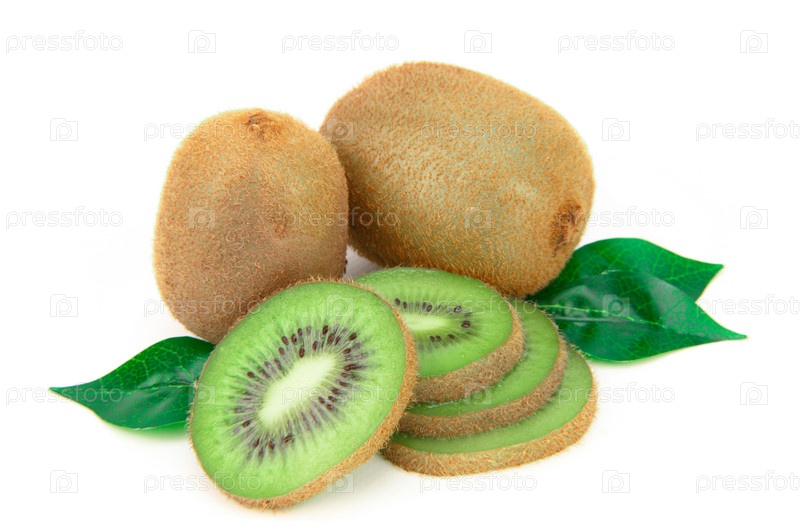 Два плода киви рядом с несколькими ломтиками киви. Зеленые листья лежат ниже