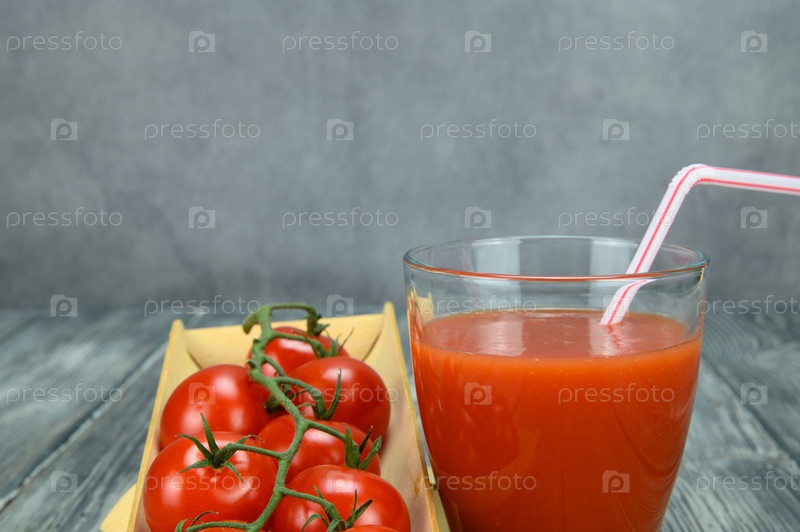 Стакан томатного сока с трубочкой и гроздь кустовых томатов лежат на деревянном подносе