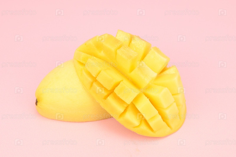 Спелый желтый плод манго с отделенной частью, нарезанной кубиками