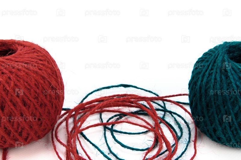 Два разноцветных клубка джутового шпагата. Часть веревки размотана и лежит между ними