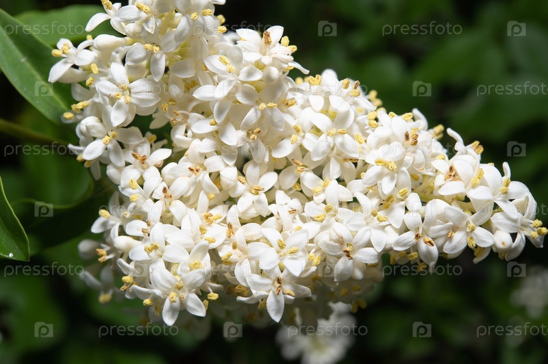 Соцветия кремово-белых цветов с узкими овальными лепестками и желтыми пушистыми тычинками