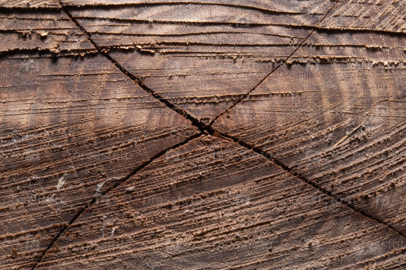 Срез распиленного дерева с трещинами, пересекающими сердцевину