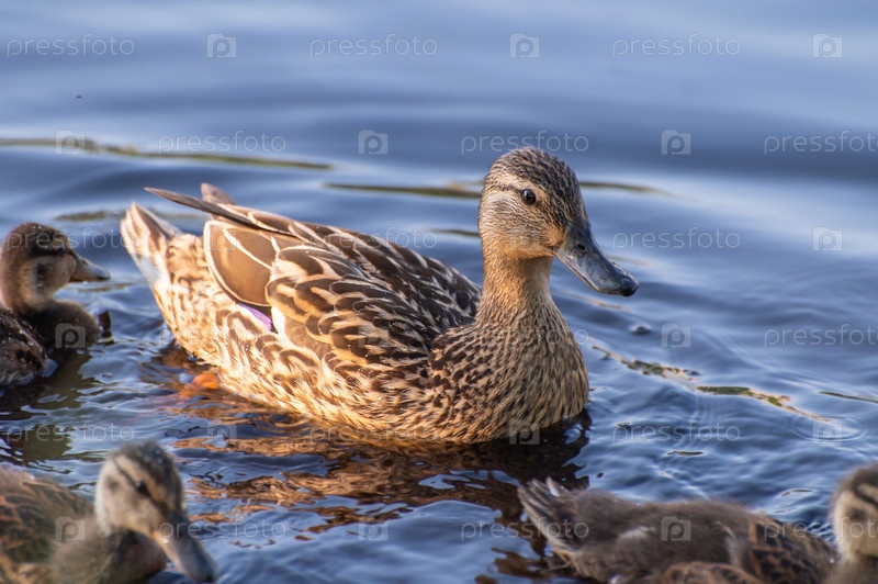 Утка с утятами плавает в пруду и настороженно смотрит в камеру