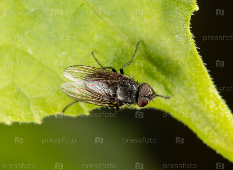 Муха с прозрачными крыльями сидит на зеленом листе