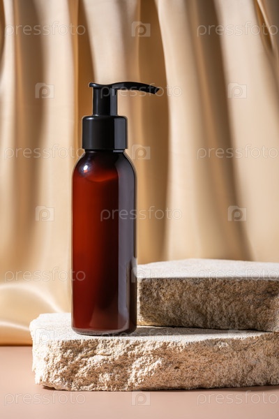 Бутылка-дозатор с помпой и лосьоном для рук или тела стоит на подиумах из натурального камня на фоне бежевой текстильной драпировки. Презентация косметики по уходу за кожей