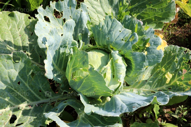Кочан белокочанной капусты с листьями, изъеденными улиткой
