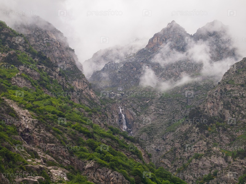 Пейзаж с водопадом в покрытых туманом горах, Черекское ущелье, Кабардино-Балкария, Россия