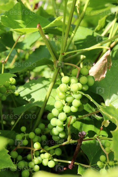 Грозди зеленого неспелого винограда на лозе в саду