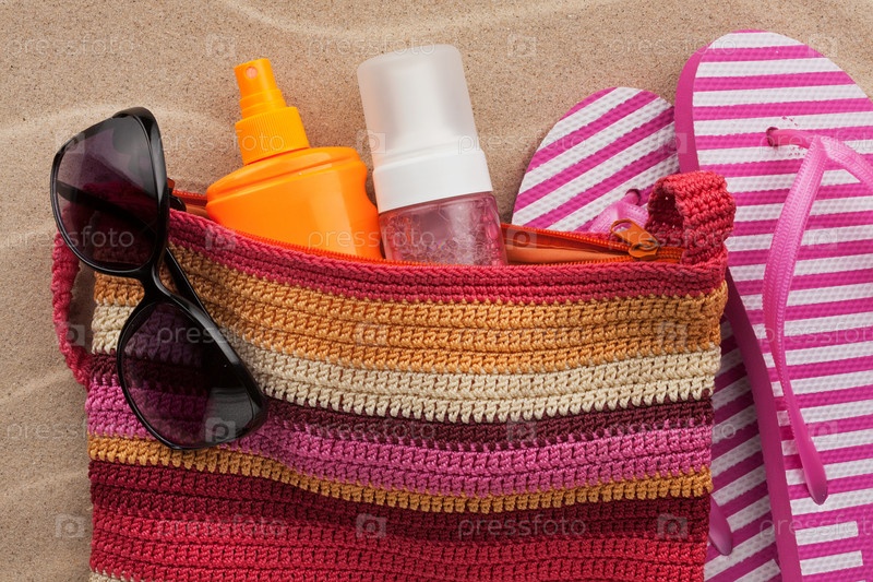 Пляжные принадлежности на песке. Сумка, цветные шлепанцы и сумка, солнцезащитный крем и солнцезащитные очки. Летний отпуск