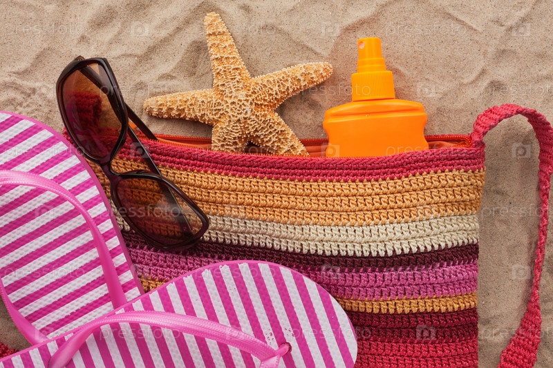Пляжные принадлежности на песке. Сумка, цветные шлепанцы и сумка, солнцезащитный крем и солнцезащитные очки. Летний отпуск. Вид сверху