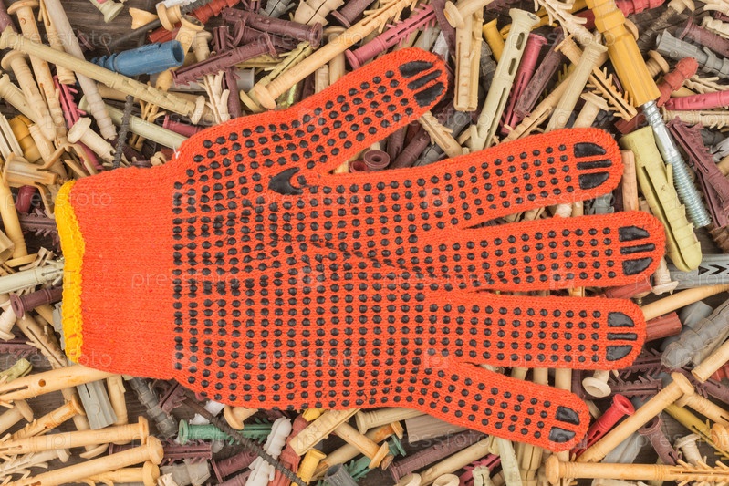 Оранжевые перчатки лежат на фоне дюбелей