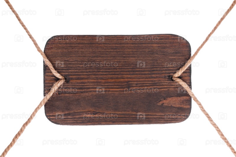 Старая деревянная вывеска из темного дерева, висящая на веревках. Изолированная