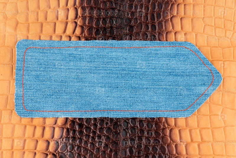 Стрелка из денима лежит на коричневой крокодиловой коже. С пространством для дизайна, текстовое место. Вид сверху