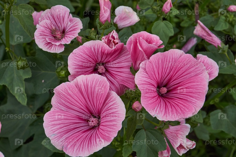 Цветок лаватера в крупном плане Лаватара цветет на лужайке сада