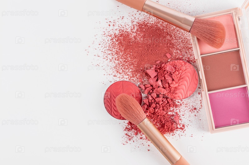 Блок, заполнение, палитра румян на рассыпчатых сухих румянах розового тона с помощью кисти для макияжа. белый фон. Вид сверху. . концепция красоты. Копировальное пространство