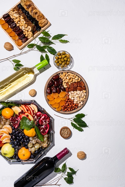 Шикарный вертикальный праздничный фон с набором различных угощений и традиционной праздничной символикой. Белый фон. Вид сверху. Плоская планировка. Место для копирования