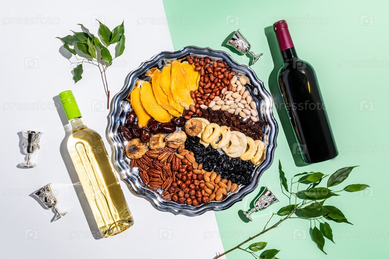 Традиционные угощения на праздник Ту би шват на белом фоне. Подносы с сухофруктами, орехами, бутылки красного и белого вина. серебряные рюмки