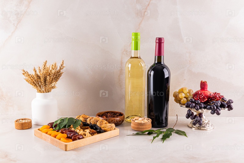 Две бутылки вина, свежие фрукты, поднос с миксом сухофруктов, миска с колосьями пшеницы на мраморной столешнице. Концепция Ту Би Шват