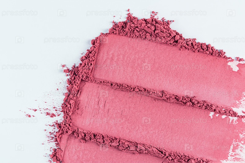 Три шикарных образца розовых румян на белом фоне. параллельные мазки сухих румян. вид сверху. Копировальное пространство. текстура косметики. крупный план