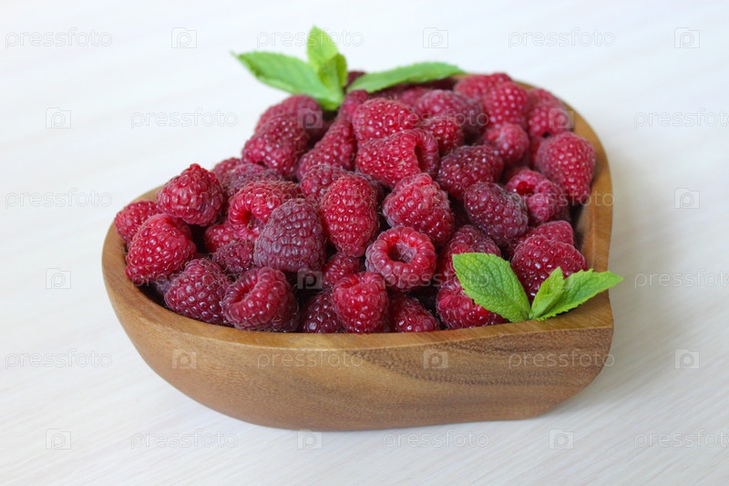 Свежая малина и листья мяты в деревянной миске в форме сердца