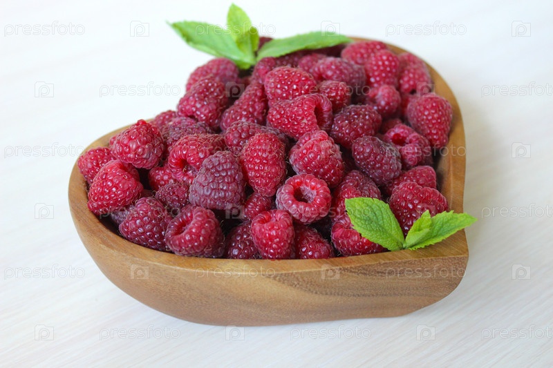 Свежая малина и листья мяты в деревянной миске в форме сердца