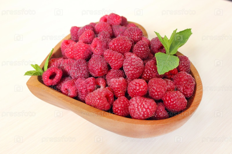 Свежая малина в деревянной чаше в форме сердца, украшенной листьями мяты