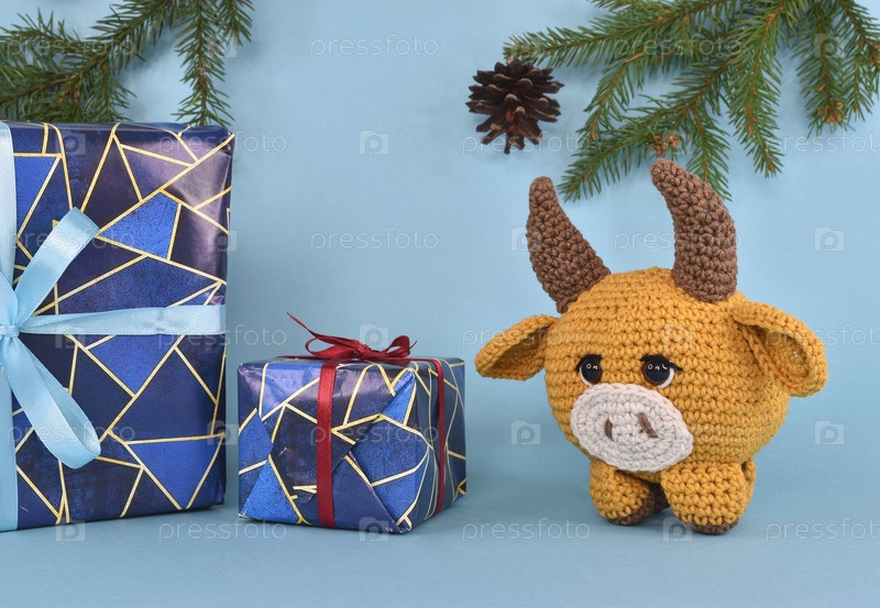 Рыжий вязаный бычок стоит рядом с упакованными новогодними подарками. За ним висят еловые ветки и одна шишка