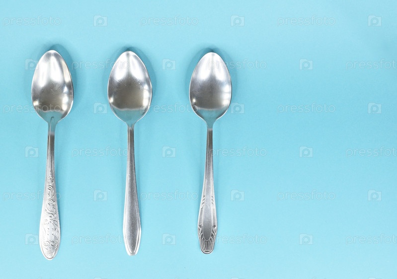 Три столовые ложки, лежащие параллельно друг другу и изолированные на светло-голубом фоне